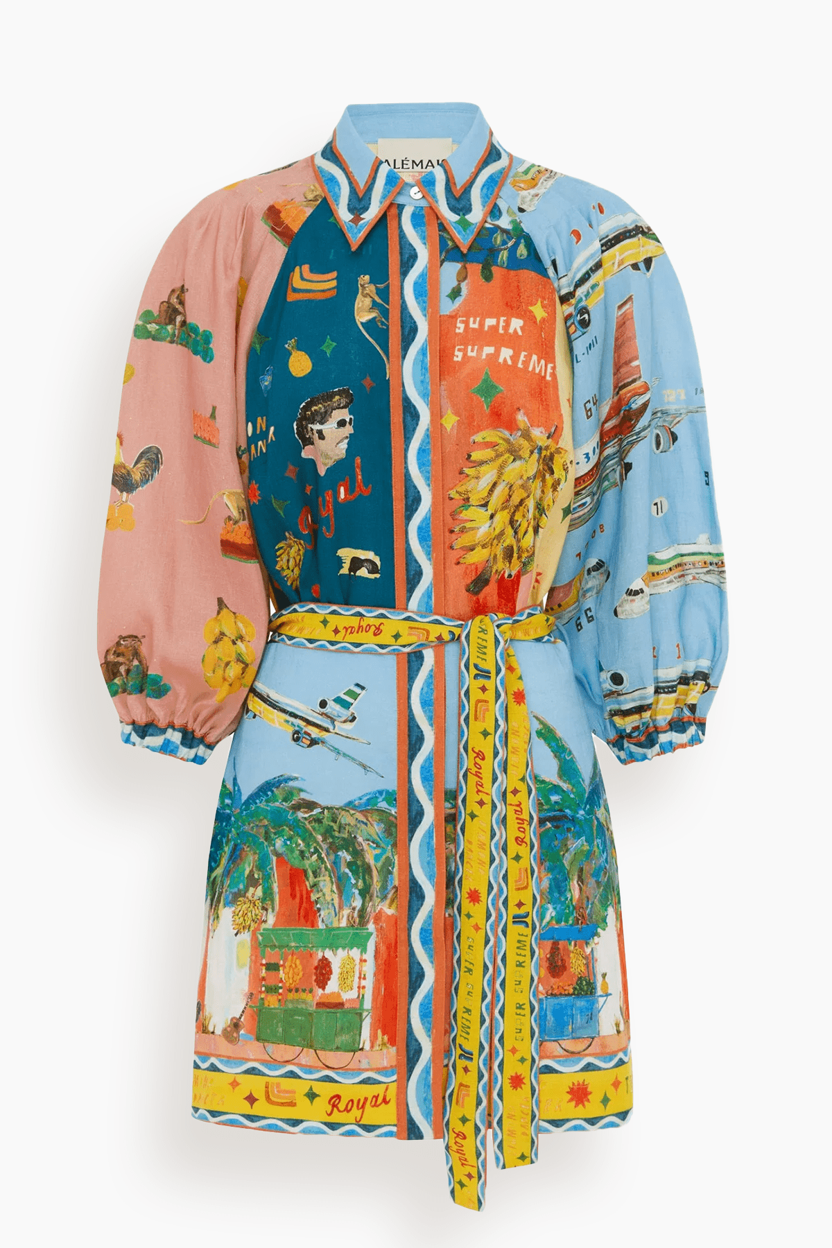 This vibrant mini dress is a celebration of color and artistry, perfect for making a statement. Featuring a loose, comfortable cut with wide, airy sleeves and a cinched waist tied with a self-belt, this dress showcases a bold tropical and nautical print. Its lightweight fabric and flowing silhouette make it an ideal choice for warm weather adventures or relaxed afternoons.
